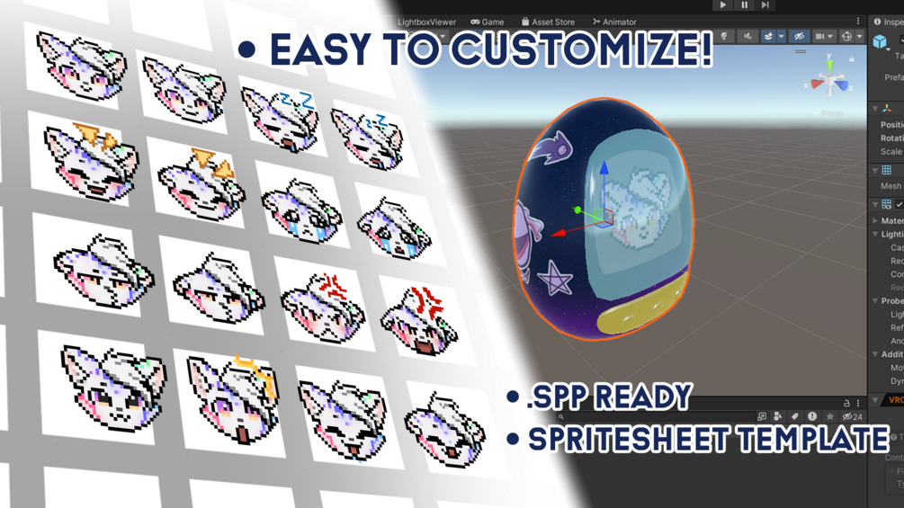 Pawlygotchi comes with 4 material presets and a ready-to-use sprite sheet to get you started. Want something unique? Use the included base SPP file and sprite sheet template to create your own custom designs.